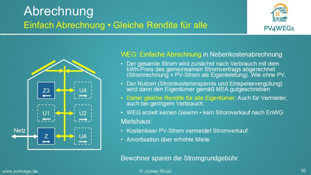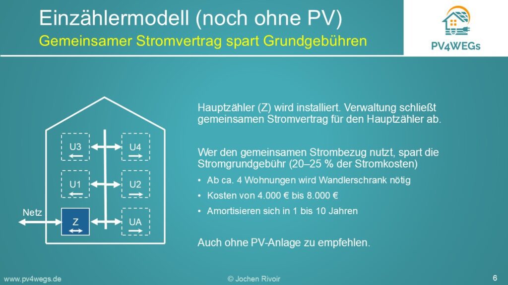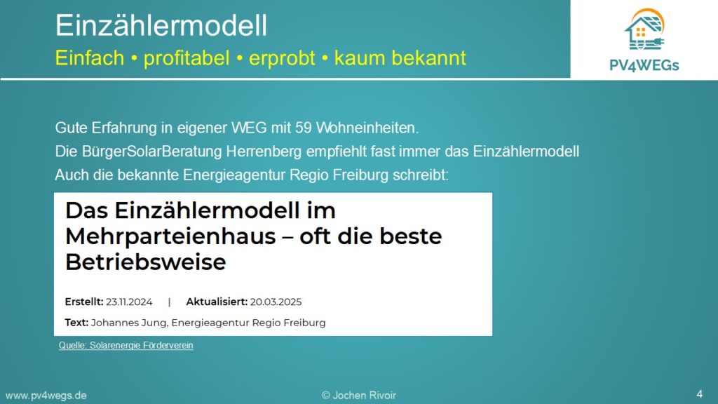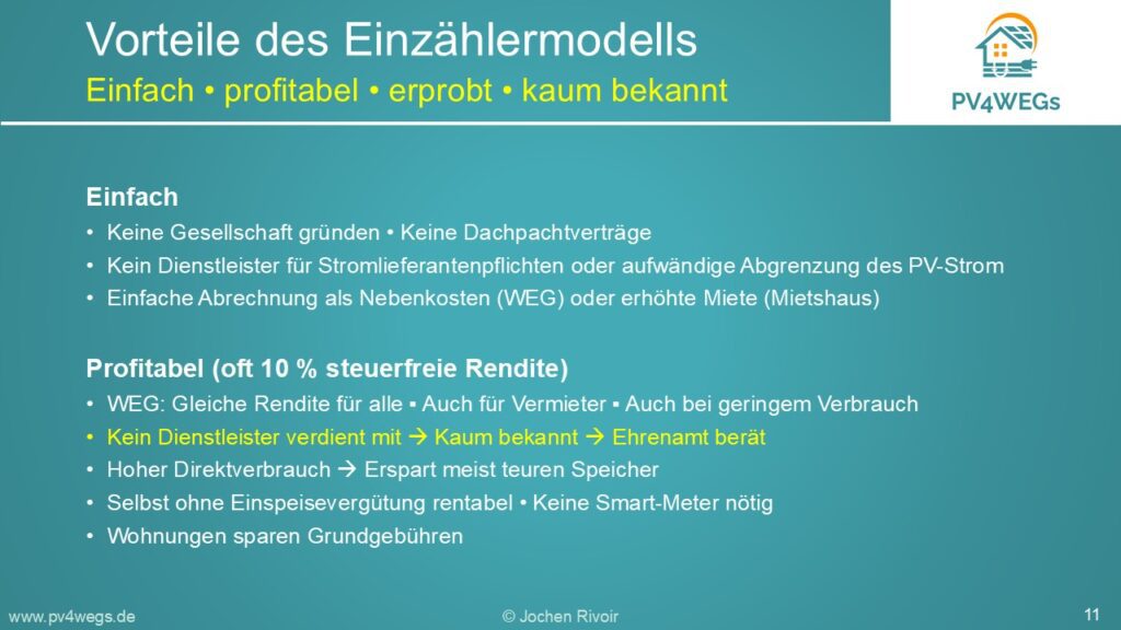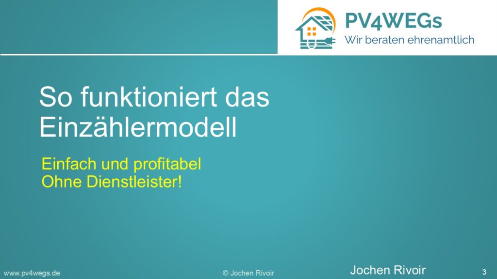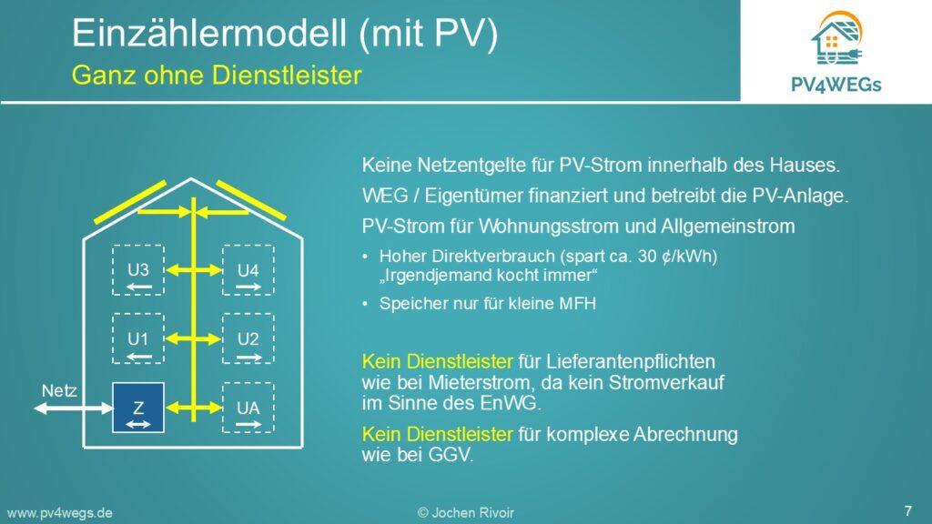 Hier erfahren Eigentümer von Wohnungseigentümergemeinschaften oder kleinen Mehrfamilienhäusern sowie Verwaltungen kurz und knapp wie das Einzählermodell zum Betrieb einer PV-Anlage funktioniert und warum es so einfach und profitabel ist.